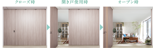 ウォールドアドアの開閉により空間に可変性をもたらすウォールドアを採用。開放することで約15.1畳の広々リビングに、また閉めることでリモートワークにも便利なプライベート空間にと、フレキシブルに使用することが可能です。