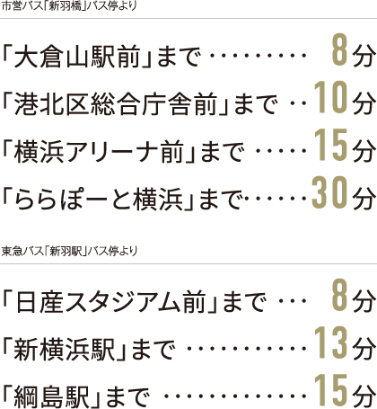 最寄りの「新羽駅」「新羽橋」バス停までは徒歩5分。バス路線が充実していることも、このエリアに暮らすメリットです。区役所などへの日常使いだけでなく、「大倉山」駅、「横浜アリーナ」「日産スタジアム」などへもバス利用で気軽に行くことができます。コンサートやサッカー観戦、ショッピングなど、暮らしの楽しみが多彩に広がります。