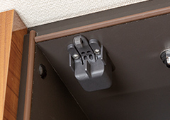 地震の揺れで吊戸棚内の食器等が飛び出さないよう、扉に耐震ラッチを設置しました。