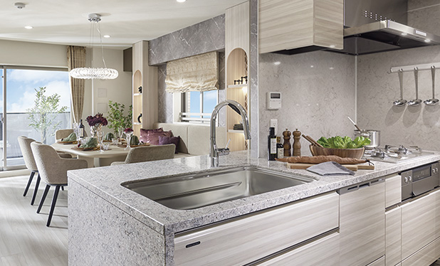 ※マンションギャラリー展示コーナーに設置されているキッチンコンロのトッププレートカラーは「フラットブラック」です。
