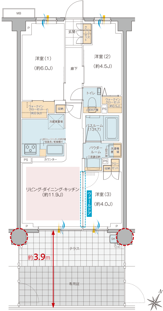 テラス・専用庭のある1階住戸ならではのメリットとして、下階への音の伝わりを心配しなくてもよいといった点も挙げられます。とくに小さなお子さまのいるご家族におすすめのプランです。