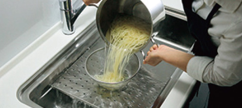 汚れや雑菌が気になるシンクの底に触れることなく、麺類の湯切りや根菜を洗うことができます。