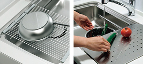 水切りプレートや調理プレートなど、用途に合わせてシンク内に3段のプレートがセット可能な機能性の高いシンクを標準装備しました。また、水跳ね音を軽減する低騒音設計を施しています。