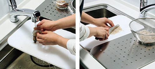 下処理が大変なエビや糸コンニャクも、シンクの上なら汚れや濡れるのを気にせずキレイに調理が可能。