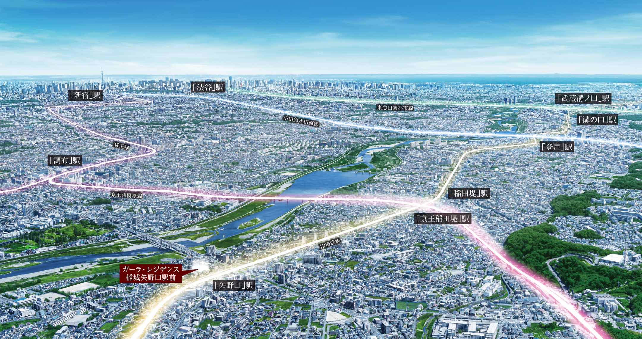 ※「調布」駅/JR南武線(各停)利⽤、「稲⽥堤/京王稲⽥堤(徒歩移動)」で京王相模原線(特急)に乗り換え