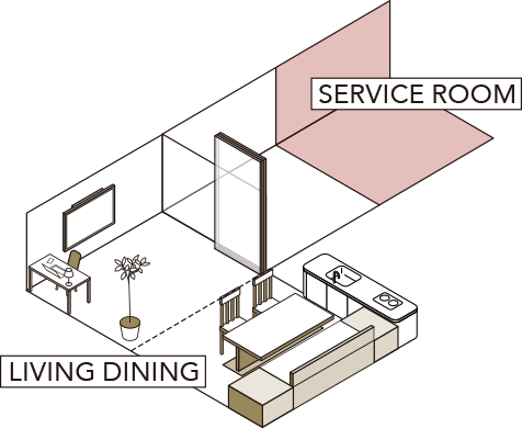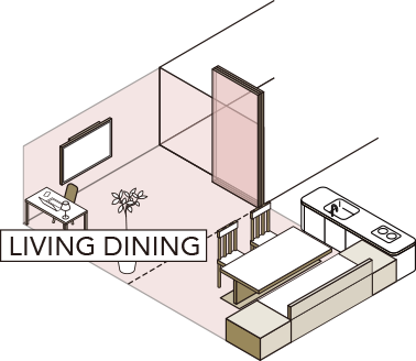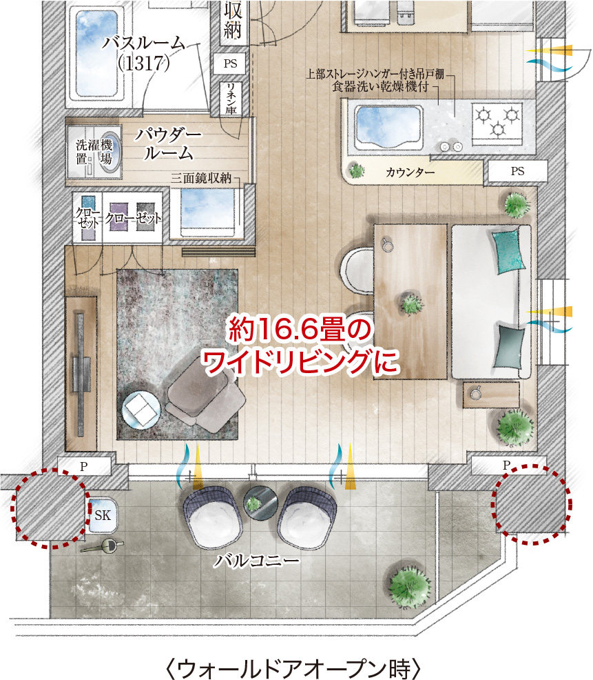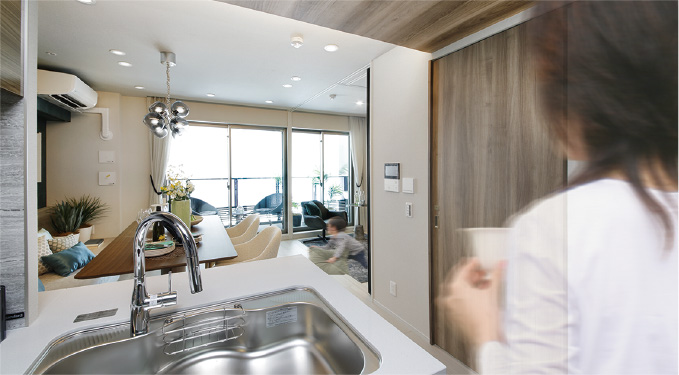 ウォールドアを開放すれば約16.6畳のワイドLDKに。ホームパーティーも楽しめる広々空間を実現するなど、ライフシーンに合わせて多彩に使いこなすことが可能です。