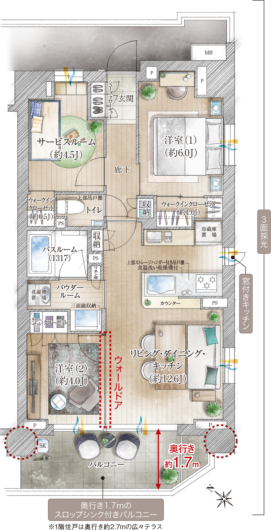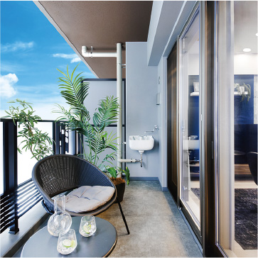 24時間換気機能付きバルコニーやテラスには便利なスロップシンク付き。植物への水やりだけでなく、汚れた運動靴も洗ってそのまま干せるので便利です。