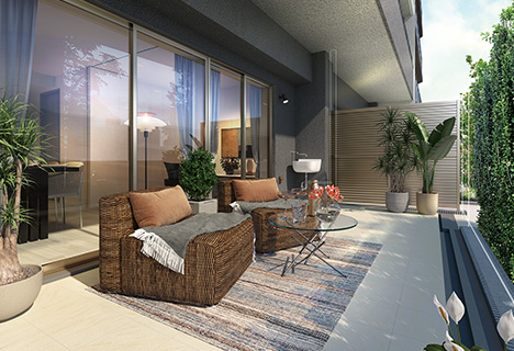 1階の全住戸には奥行きのある広々とした専用のテラスをご用意。アウターリビングやお子様の遊び場など多彩にご利用いただけます。
